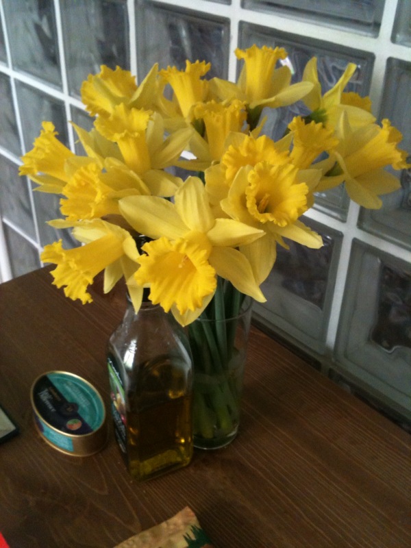 Thankful for… Finishing work early and heading off to see a friend, afternoon tea in the garden, sunshine, ant wars, scones, cream and jam. The uber lovely daffodils in our kitchen. Fun evening in watching The Island with husbandface and temporary housemate Dave.