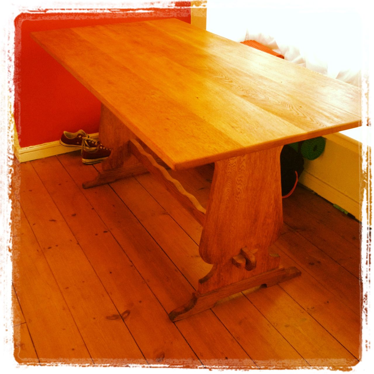 The table is now heading to pastures new. When we moved into our new flat it couldn’t fit into the kitchen to be usable. When we moved here it lived in our giant corridor between the rooms. Occasionally we sat around it, special meals and New Year celebrations were enjoyed around it.  Sadly though it’s become a bit more of a storage table for all the random objects in our life. Having to move furniture around this summer for the impending arrival of our small squirmy baby has coincided with the return of my lovely brother and his family from Canada. They need a table. We don’t anymore. We need the space.