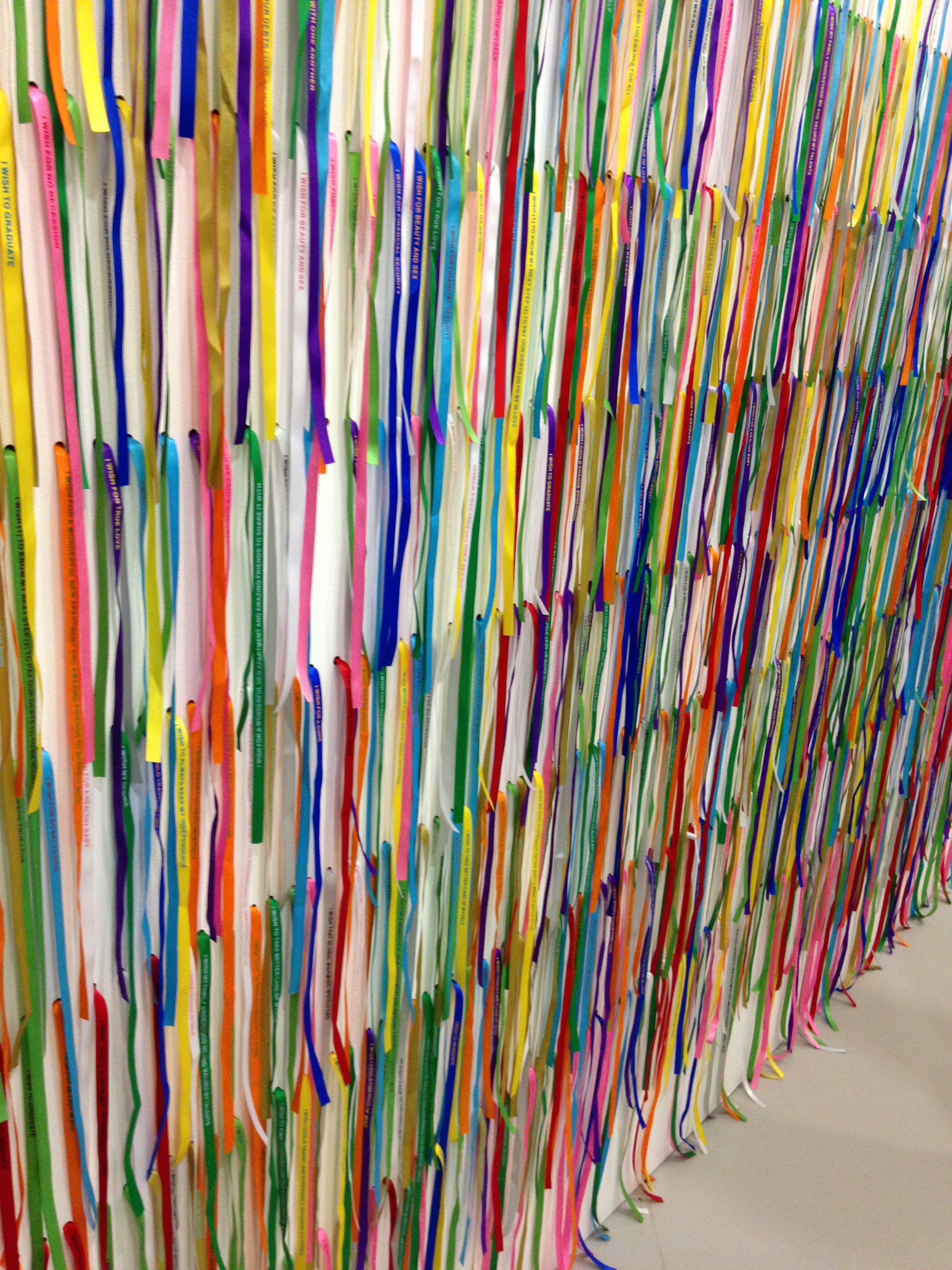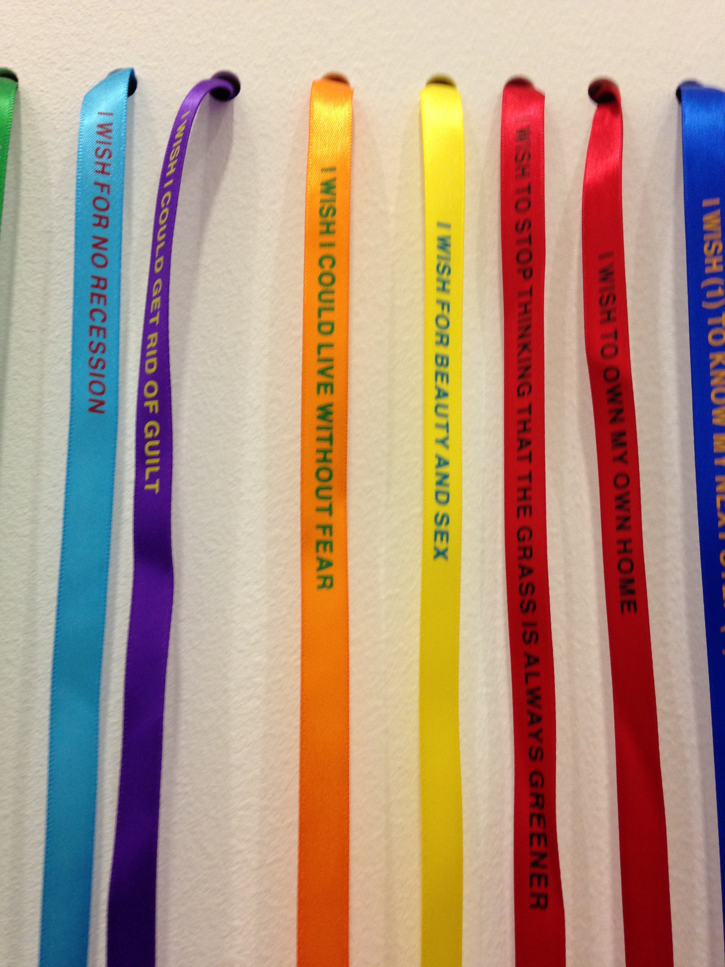 We visited the Tate in St Ives on a rainy day, we weren’t all that impressed with the exhibitions this year as in previous years but one caught my breath and made me cry. It was a display of wishes from local people and people visiting the town. (Rivane Neuenschwander’s large-scale participatory work I Wish Your Wish) Wishes printed out on pretty ribbons for all to read. Wishes like: I wish I had a lot of friends. I wish for financial security. I wish I could get rid of the guilt. I wish I could live without anxiety. I wish I had a turtle and there were no wars. I wish to graduate. I wish for an easy death.