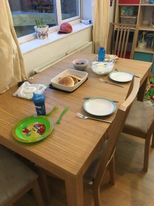 Small one on counter top munches blueberries. Eldest snuggles on the sofa waiting for breakfast.