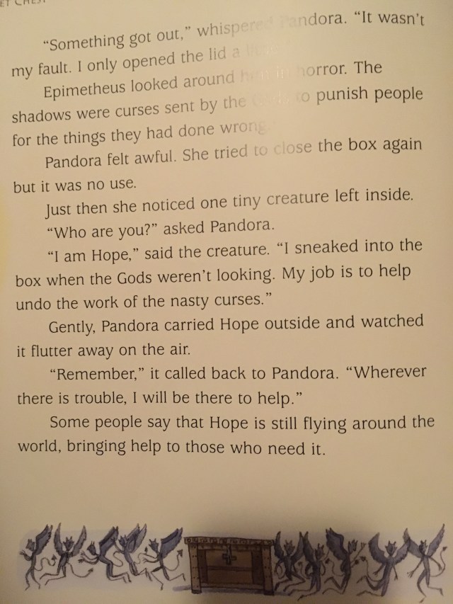 Tonight I read Son1 the story of Pandora’s Box (the child friendly one). The end hit me all over again. A tiny creature called Hope is left at the bottom of the box. Hope is then let loose into the world.