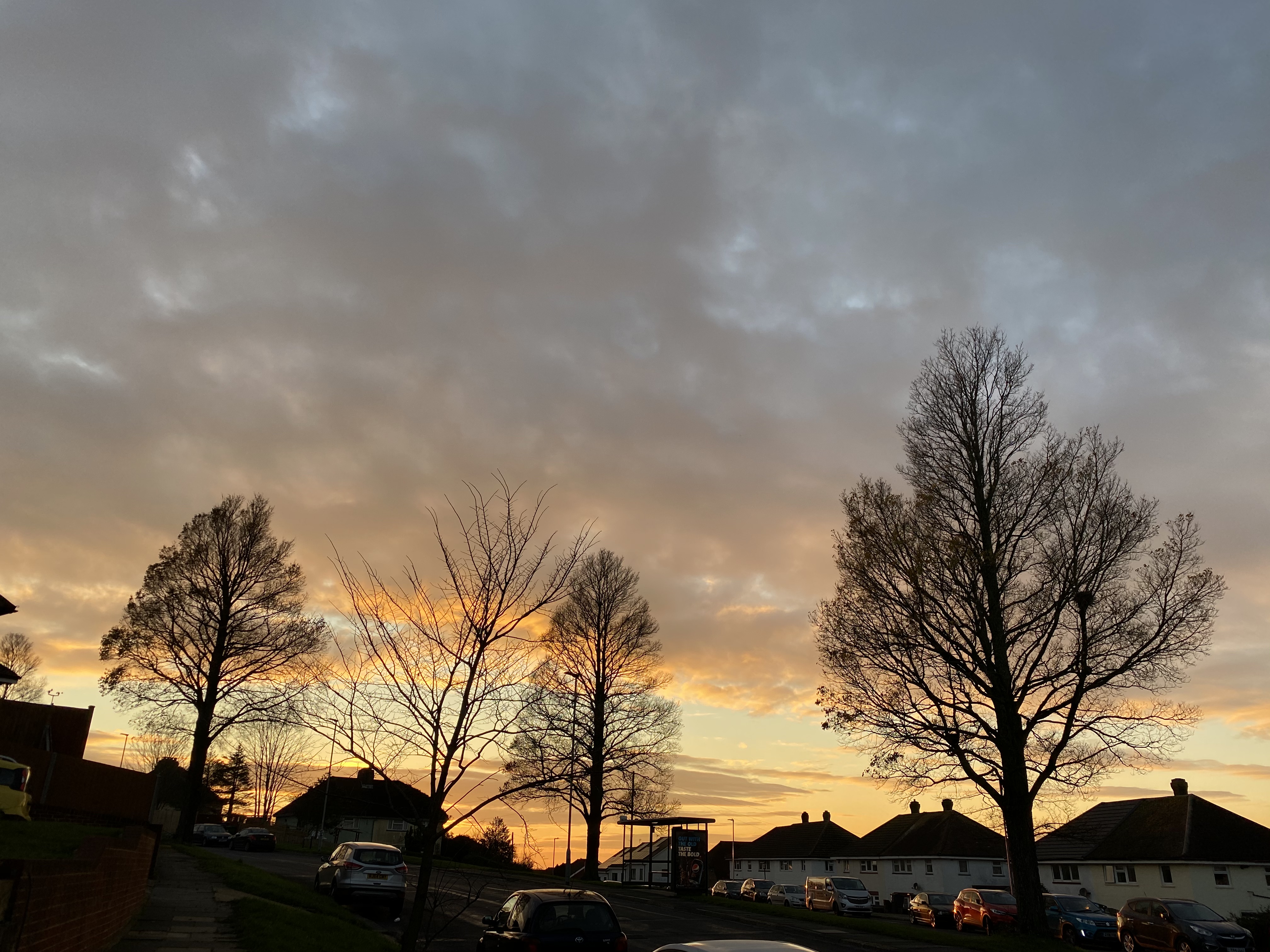 Wonder at the sunset on my first trip out of the house today. I wonder in this wonder how long this ill feeling will last, when I’ll get back to my morning walks? I wonder and then I am grateful for this privilege of being able to walk out of the house and see the wonderful sky. This will pass. I am frustrated but also wanting to find the hope in the midst of this waiting slow. And here’s a verse from ‘It Came Upon a Midnight Clear’ which seems appropriate for us all right now.