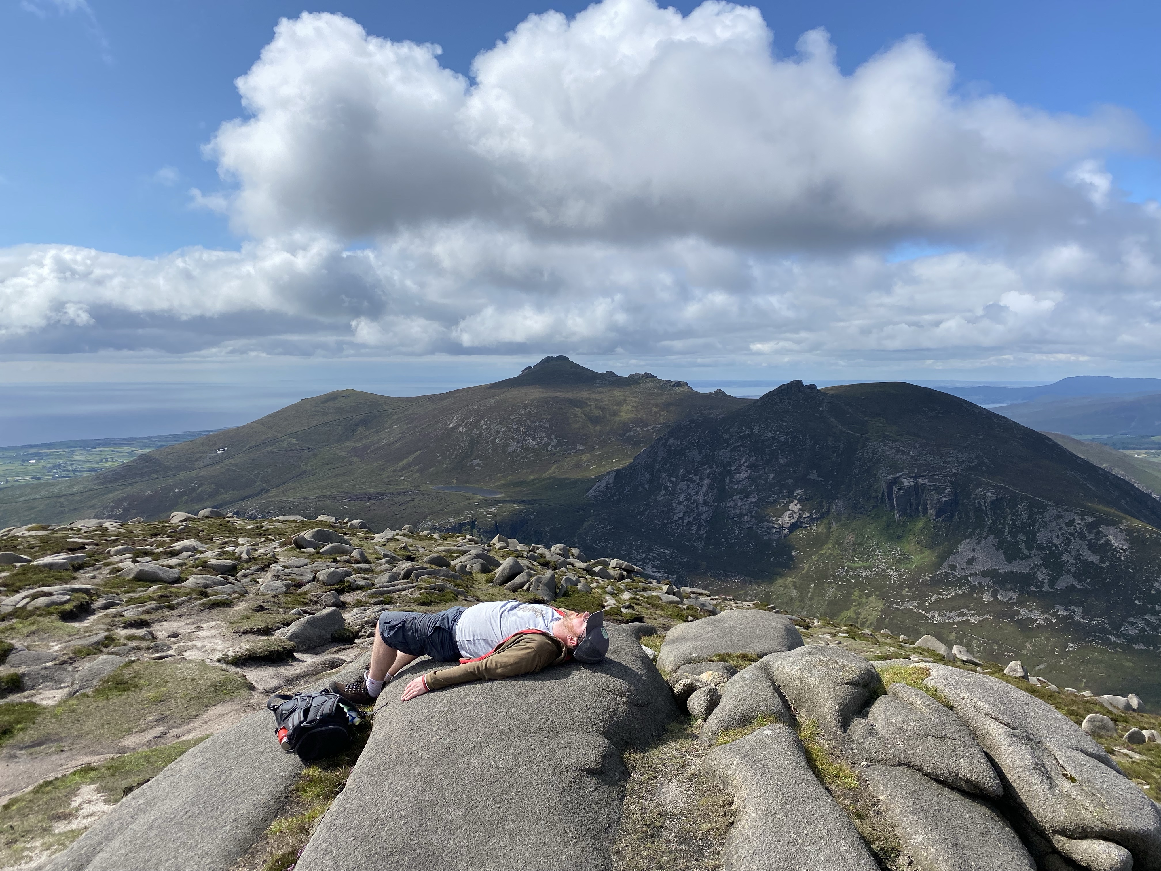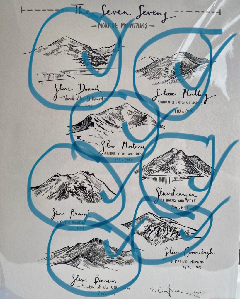 I clambered up on a bright sunny day, I gasped in awe at the mountains all around me, I felt the nervous feeling as I drove down empty roads to the starting point. I was stunned by the silence, the lack of other people, the crags and mountain streams. I puffed and panted my way to the top proud that I could remember how to navigate and breathe. My back felt sore but not devastatingly so. I went back down and stared at my Christmas present from the husbandface, a picture of seven Slieve’s supposedly over 700m (let’s ignore that later people realised that Meelmore was just under at 682m). Which one would be next?